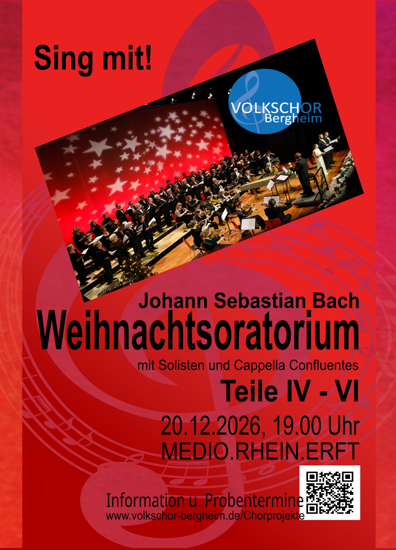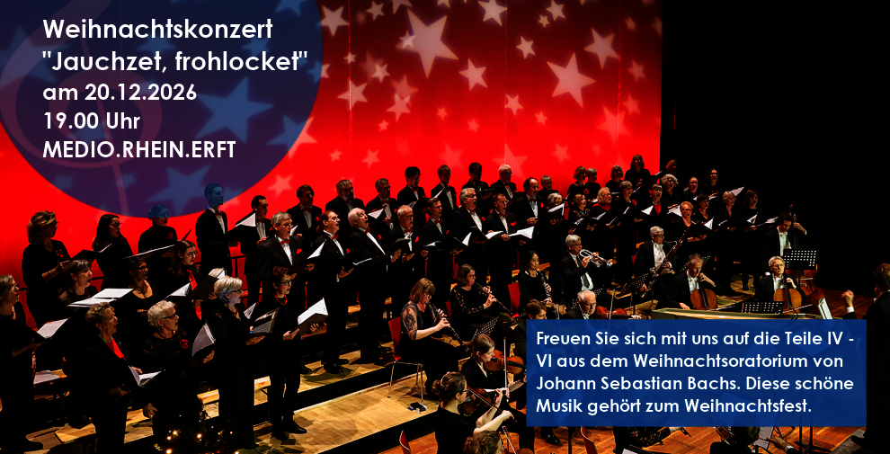 Sie singen gerne, lieben anspruchsvolle Probenarbeit und haben Spaß im tollen Bergheimer Veranstaltungshaus MEDIO mit uns, Solisten und einem Orchester aufzutreten? Dann kommen Sie zu den Proben und machen mit!